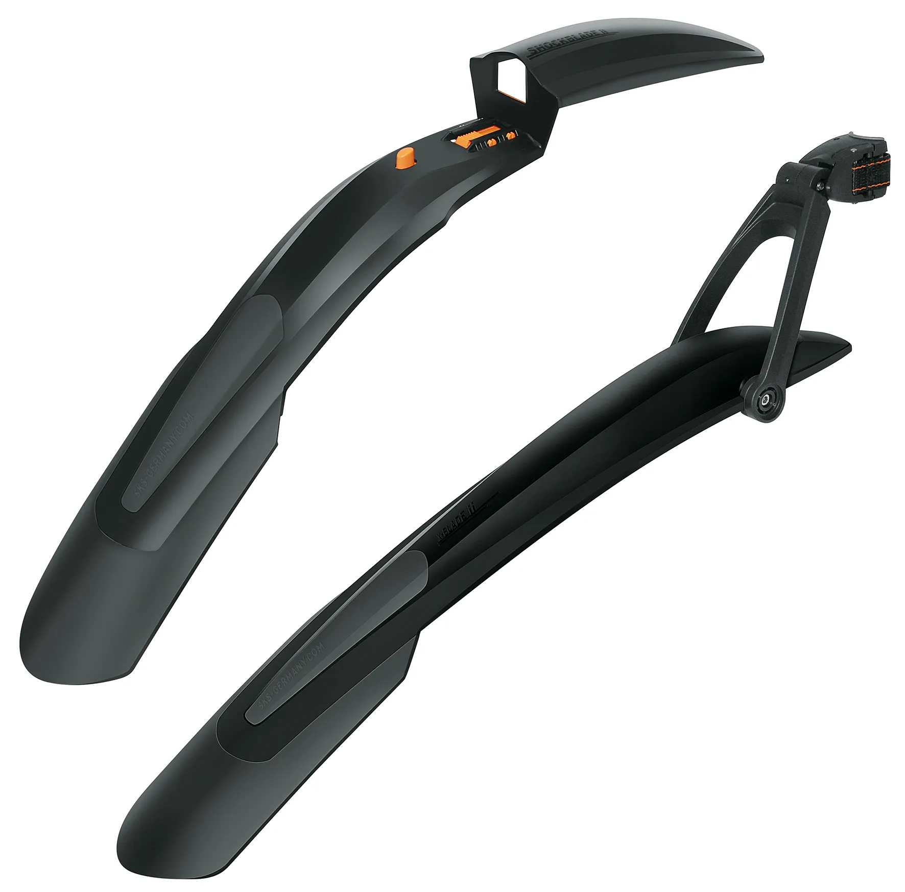 Skärmset SKS Shockblade/X-Blade Dark 27,5/29in Svart – bakskärm: X-BLADE ger utökat stänkskydd för mountainbiken med en justerbar frontspoiler och en extra lång bakspoiler i mjukare plast som också skyddar vid på- och avstigning; snabbkopplingen och powerstraps låter dig fästa skärmen på nästan alla sadelstolpar och 2-länkstekniken ger flexibel anpassning, svart design, tillverkad av högkvalitativ 2-komponentsplast i Tyskland, vikt 239 g, max ytterdiameter 35 mm, hjulstorlek 29″, däckbredd 2,0″–3,0″ (52–75 mm), bakskärmens längd 620 mm.